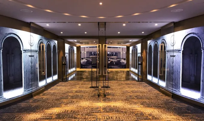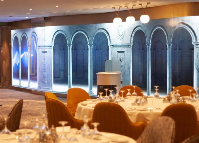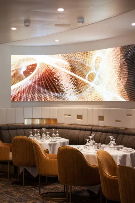 150 square meters of Unilumin's flexible LED solution creates an amazing atmosphere for both the entrances of the main dining room deck 4 and deck 5 on Royal Caribbean 'Spectrum of the Seas' as well as inside the venue. All require both convex and concave installations, creating a unique design achieved by applying soft modules with a pixel pitch of 1.9mm, specially coated for protection in high footfall areas as well as washable for accidental liquid spillage. Highly reliable for 24/7 operation in a challenging environment with very low heat emission.